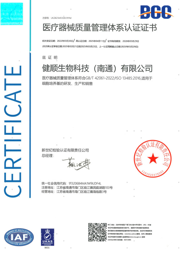 健顺生物始终以提供高质量产品与服务为核心,构建了全面且严苛的质量管理体系。体系以多重权威认证与合规备案为基础:通过 ISO 13485、ISO 9001、ISO 14001、ISO 45001、FSSC22000 及 HALAL 等国际国内认证,2015 年完成细胞培养基一类医疗器械备案,部分产品亦在美国 FDA 完成 DMF 备案,从资质层面奠定质量保障基石。